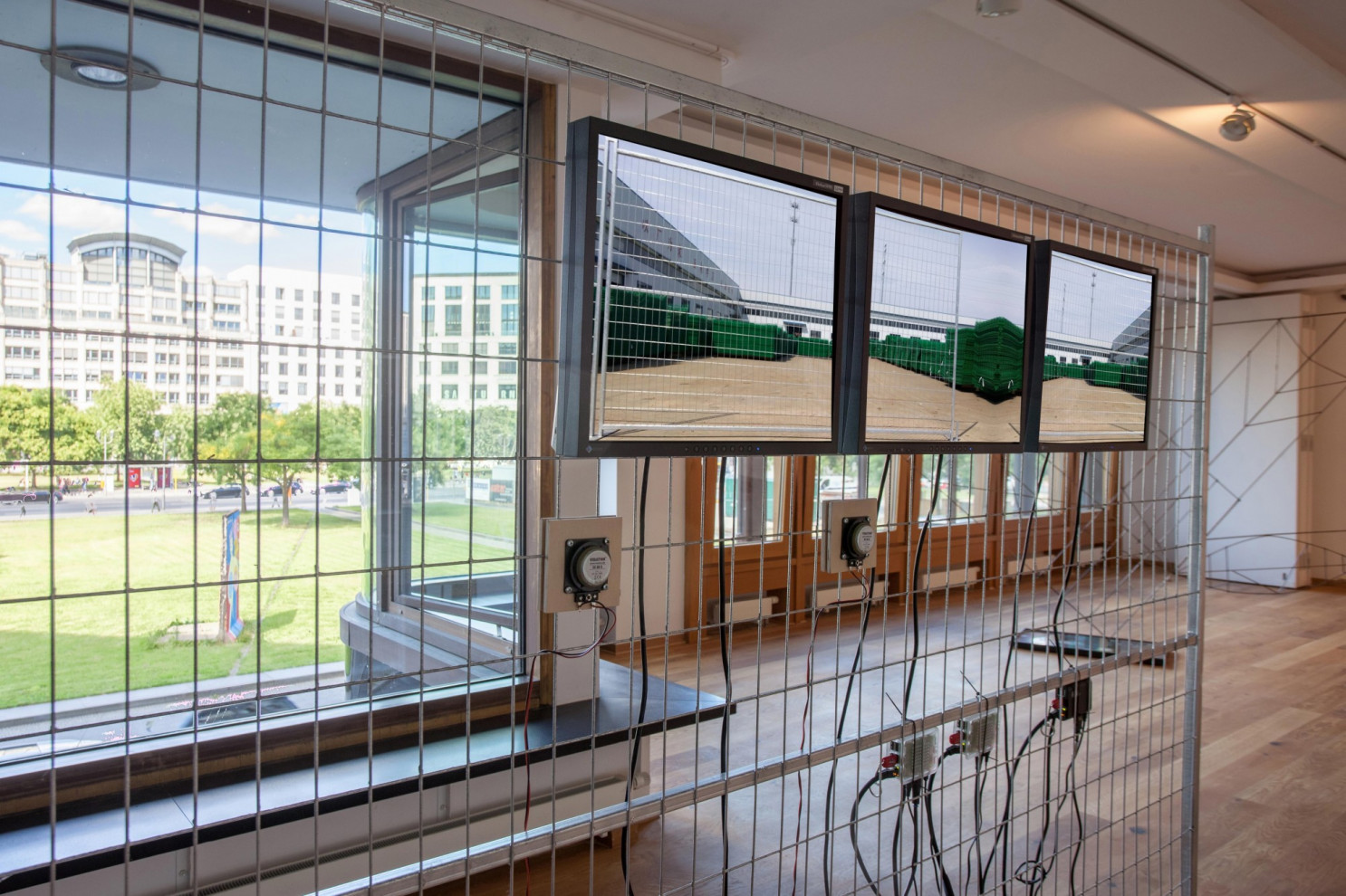 Installation components: fence panel, fence feet, LCD displays and contact loudspeakers mounted on wooden planks, amplifier, network-synchronized multimedia boards, video looping algorithm, cables and connectors.